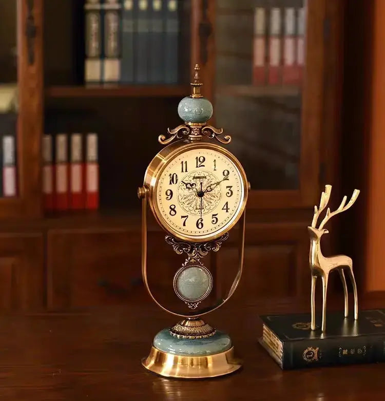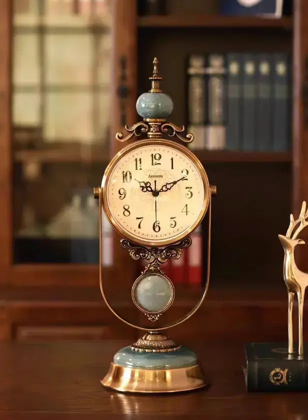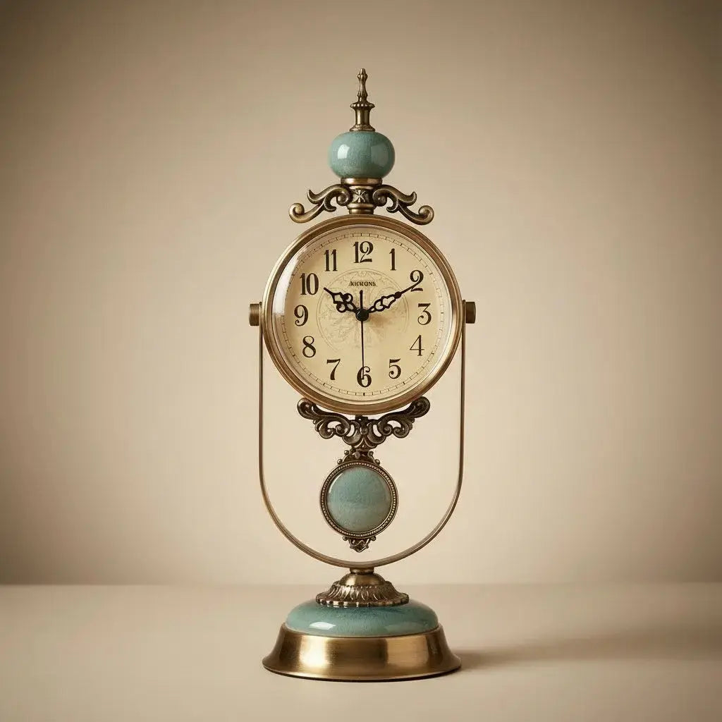 Designed as a statement décor piece, this luxury retro table clock blends European classical aesthetics with modern craftsmanship. Featuring an ornate metal frame, ceramic details, and a refined pendulum design, it brings timeless elegance to living rooms, studies, and curated interiors.