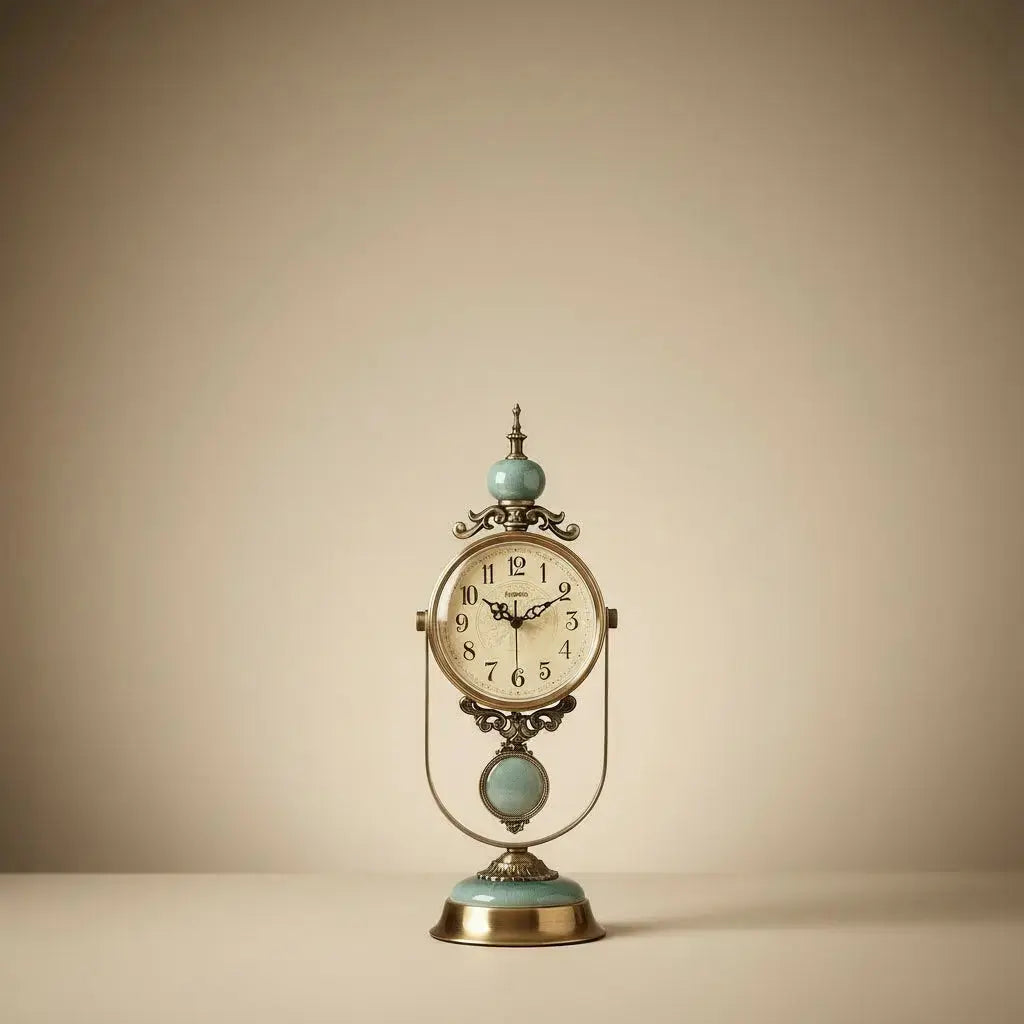 Inspired by classic American and European table clocks, with elegant proportions, decorative metal curves, and a vintage dial layout. -